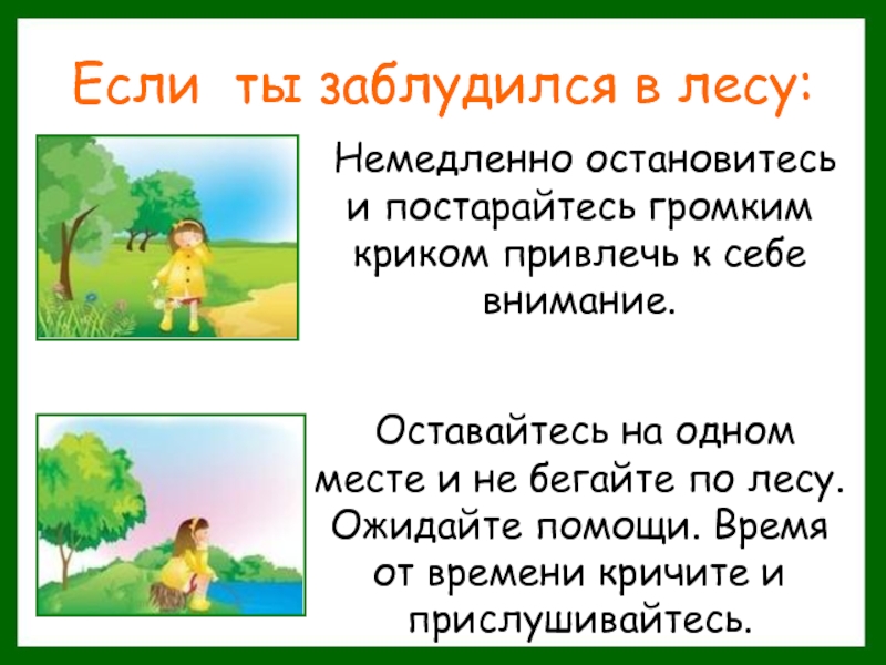 Оставайтесь на одном месте и не бегайте по лесу. Ожидайте помощи. Время от времени кричите и прислушивайтесь.