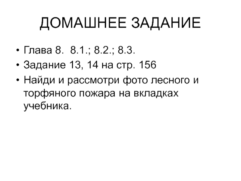 ДОМАШНЕЕ ЗАДАНИЕГлава 8. 8.1.; 8.2.; 8.3.Задание 13, 14 на стр. 156Найди и рассмотри фото лесного и торфяного