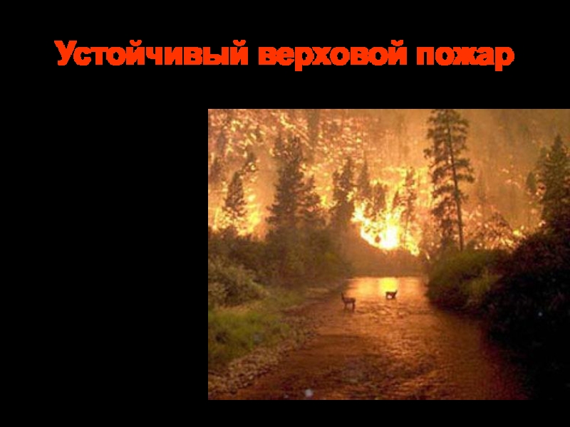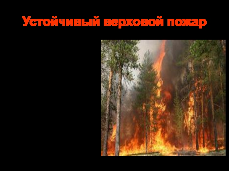 Устойчивый верховой пожарГорение крон деревьев и подстилки происходит одновременно. Выделяется огромное кол-во теплоты, которое способствует образованию сильных