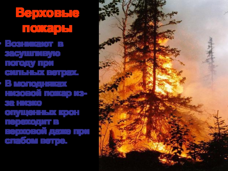 Верховые пожарыВозникают в засушливую погоду при сильных ветрах. В молодняках низовой пожар из-за низко опущенных крон переходит