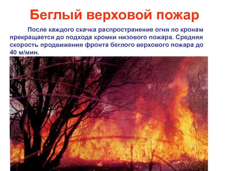 Беглый верховой пожар  При беглом верховом пожаре огонь распространяется по кронам скачками со скоростью 250—330 м/мин.
