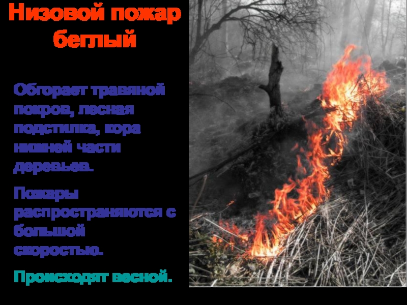 Низовой пожар беглыйОбгорает травяной покров, лесная подстилка, кора нижней части деревьев.Пожары распространяются с большой скоростью.Происходят весной.