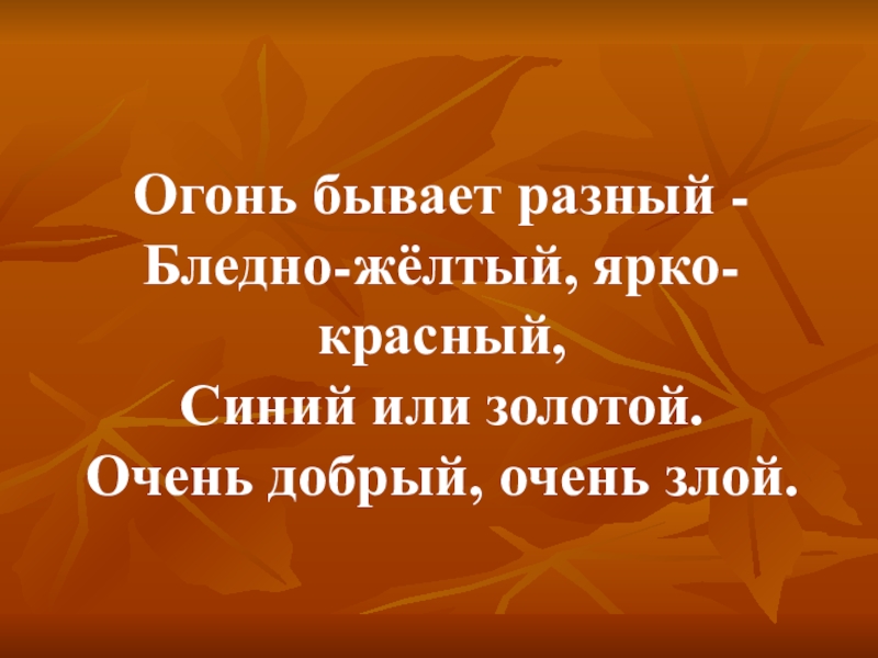 Слайд 2Огонь бывает разный - Бледно-жёлтый, ярко-красный, Синий или золотой. Очень добрый, очень