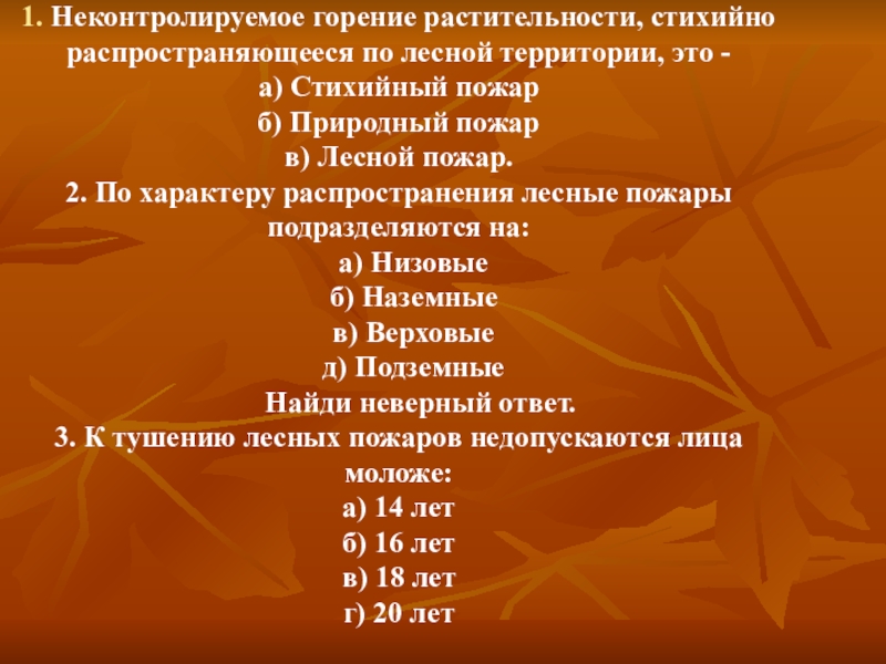 Стихийный пожар б) Природный пожар в) Лесной пожар. 2. По характеру распространения лесные пожары подразделяются на:     а) Низовые     б) Наземные     в) Верховые     д) Подземные       Найди неверный ответ. 3. К тушению лесных пожаров недопускаются лица моложе: а) 14 лет б) 16 лет в) 18 лет г) 20 лет
