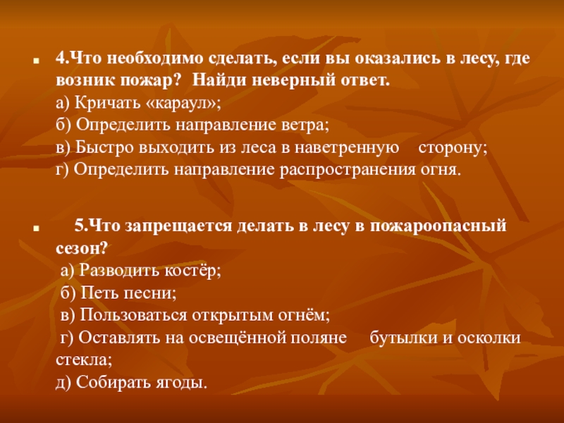 5.Что запрещается делать в лесу в пожароопасный сезон?  а) Разводить костёр;  б) Петь песни;  в) Пользоваться открытым огнём;  г) Оставлять на освещённой поляне     бутылки и осколки стекла; д) Собирать ягоды.