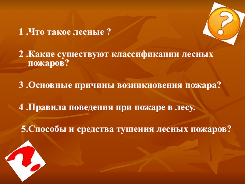 1 .Что такое лесные ?2 .Какие существуют классификации лесных пожаров?3 .Основные причины возникновения пожара?4 .Правила поведения при