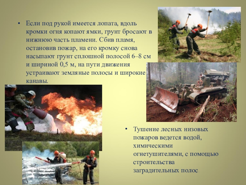 Тушение лесных низовых пожаров ведется водой, химическими огнетушителями, с помощью строительства заградительных полос.