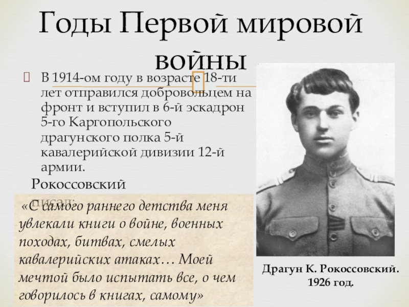 «С самого раннего детства меня увлекали книги о войне, военных походах, битвах, смелых кавалерийских атаках… Моей мечтой было испытать все, о чем говорилось в книгах, самому»