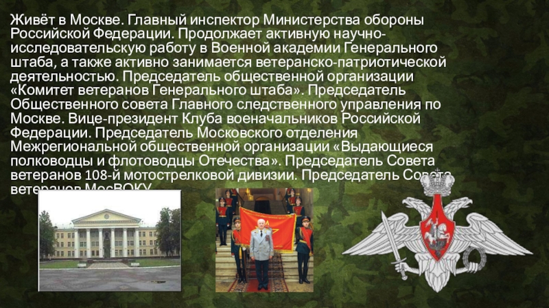 Слайд 7Живёт в Москве. Главный инспектор Министерства обороны Российской Федерации. Продолжает активную