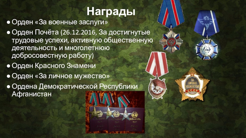 НаградыОрден «За военные заслуги»Орден Почёта (26.12.2016, За достигнутые трудовые успехи, активную общественную деятельность и многолетнюю добросовестную работу)