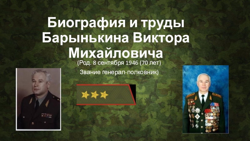Биография и труды Барынькина Виктора Михайловича	(Род. 8 сентября 1946 (70 лет)Звание генерал-полковник)