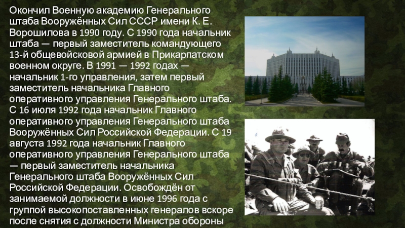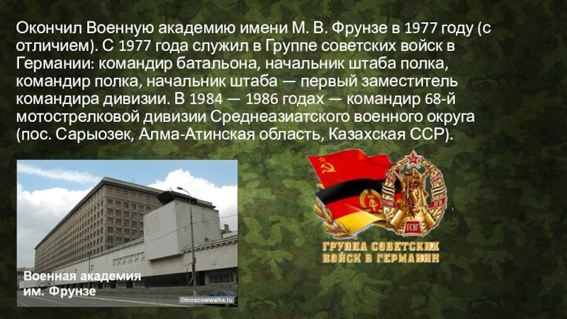 Слайд 3Окончил Военную академию имени М. В. Фрунзе в 1977 году (с