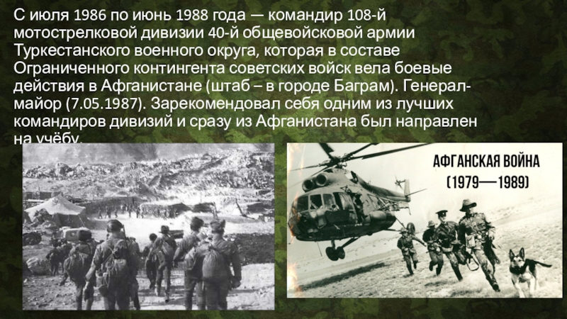 Слайд 4С июля 1986 по июнь 1988 года — командир 108-й мотострелковой