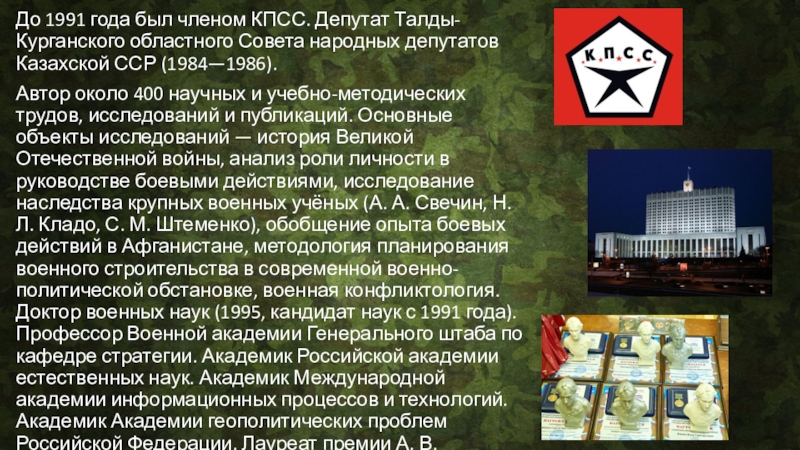 Слайд 6До 1991 года был членом КПСС. Депутат Талды-Курганского областного Совета народных