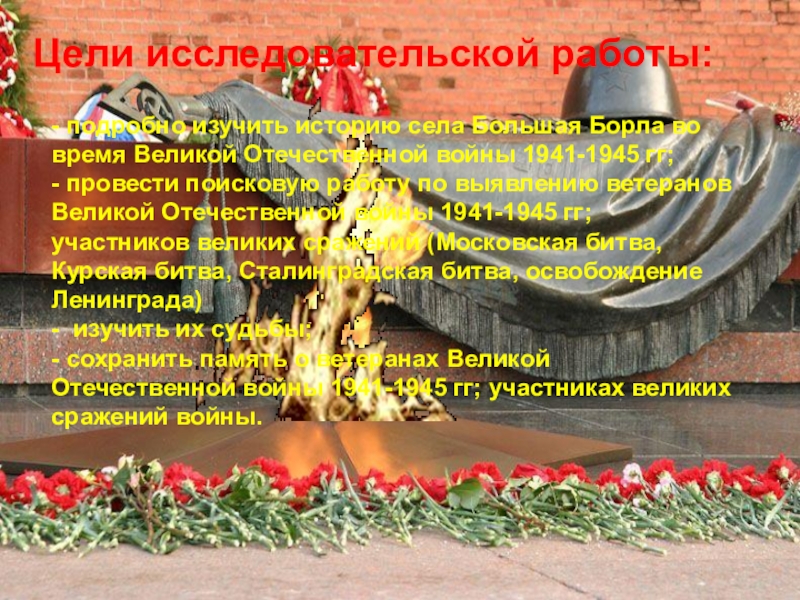 - подробно изучить историю села Большая Борла во время Великой Отечественной войны 1941-1945 гг;