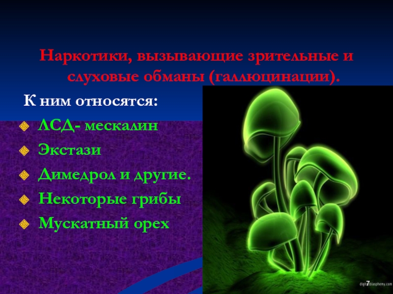 Наркотики, вызывающие зрительные и слуховые обманы (галлюцинации).