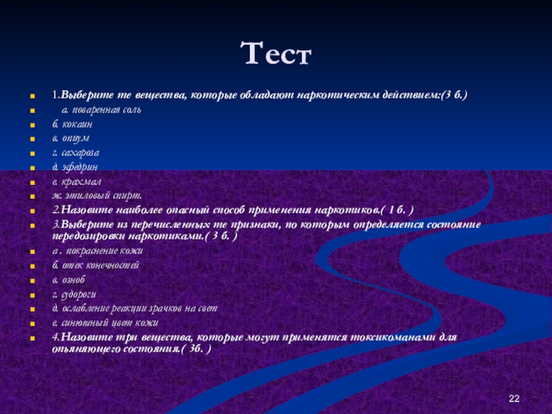 Тест1.Выберите те вещества, которые обладают наркотическим действием:(3 б.)  а. поваренная сольб. кокаинв. опиумг. сахарозад. эфедрине. крахмалж.