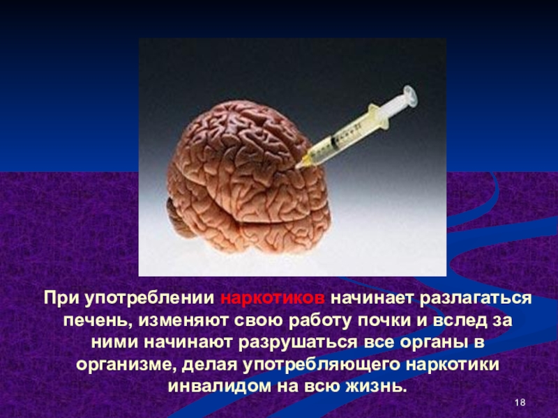 Слайд 18При употреблении наркотиков начинает разлагаться печень, изменяют свою работу почки и