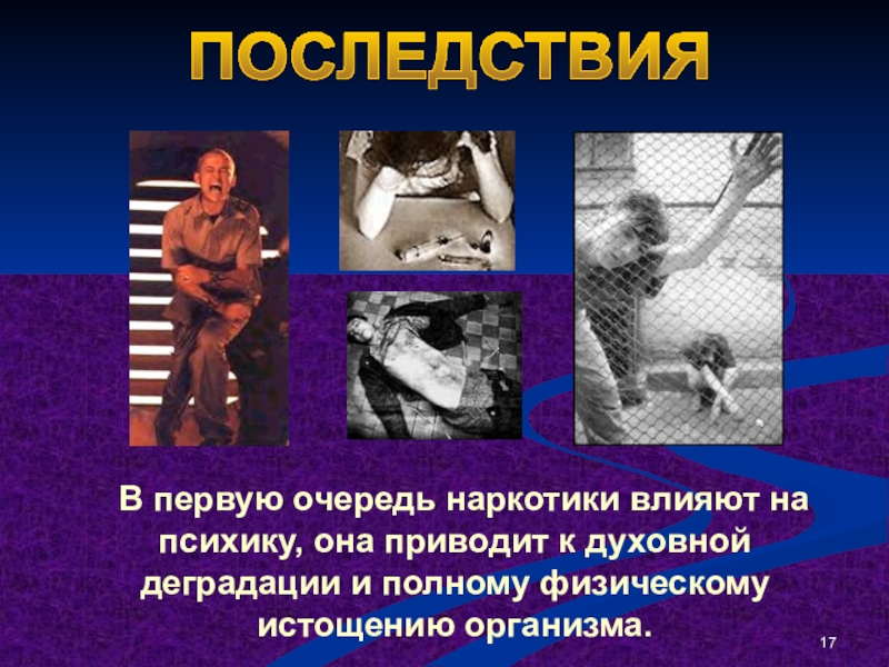 ПОСЛЕДСТВИЯ  В первую очередь наркотики влияют на психику, она приводит к
