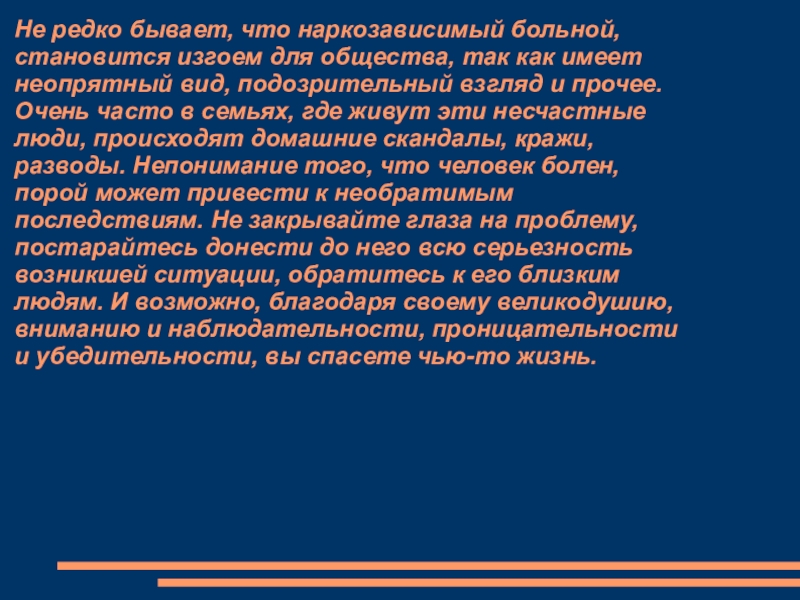 Слайд 9Не редко бывает, что наркозависимый больной, становится изгоем для общества, так