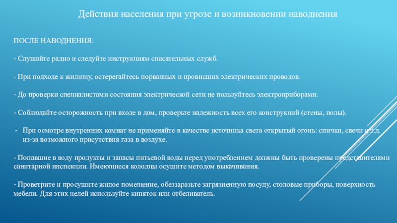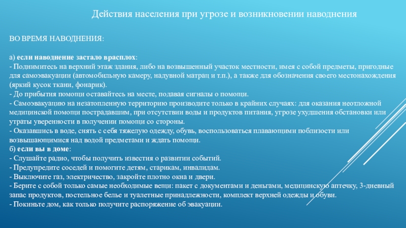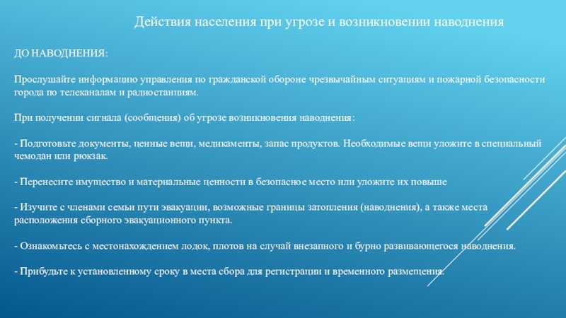 Слайд 10Действия населения при угрозе и возникновении наводнения