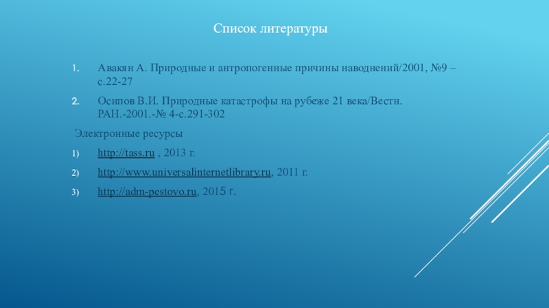 Слайд 13Авакян А. Природные и антропогенные причины наводнений/2001, №9 – с.22-27