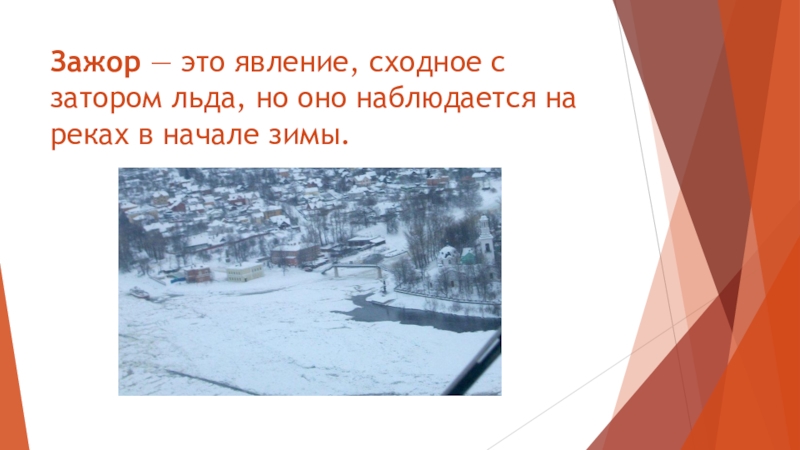Слайд 9Зажор — это явление, сходное с затором льда, но оно наблюдается на