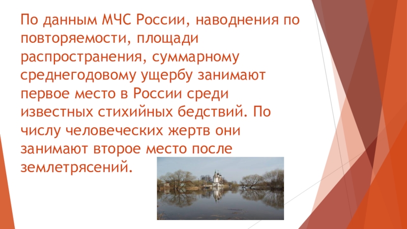 Слайд 2По данным МЧС России, наводнения по повторяемости, площади распространения, суммарному среднегодовому