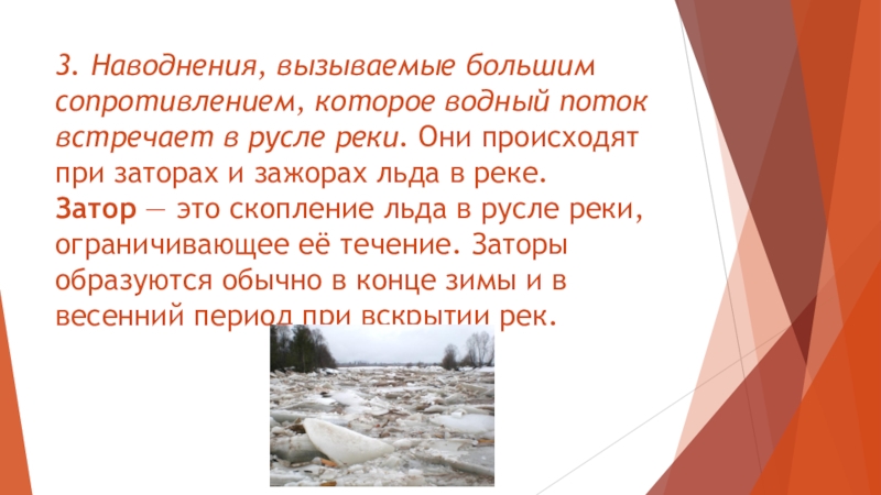3. Наводнения, вызываемые большим сопротивлением, которое водный поток встречает в русле реки. Они происходят при заторах и зажорах