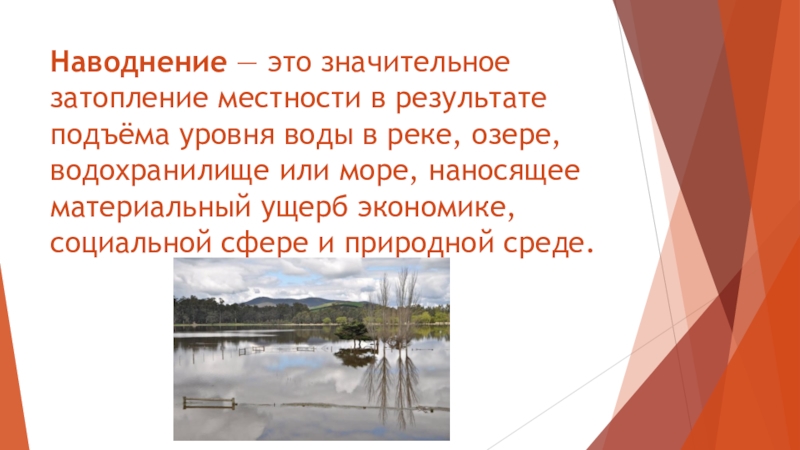 Слайд 4Наводнение — это значительное затопление местности в результате подъёма уровня воды в