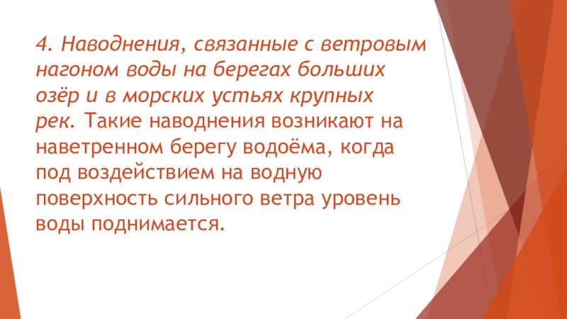 4. Наводнения, связанные с ветровым нагоном воды на берегах больших озёр и в морских устьях крупных рек. Такие