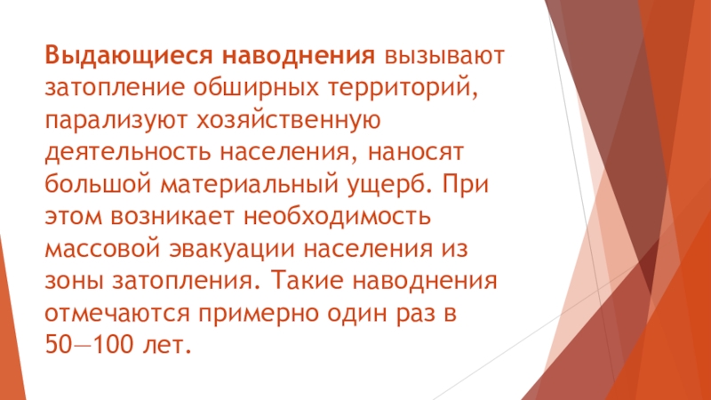 Слайд 13Выдающиеся наводнения вызывают затопление обширных территорий, парализуют хозяйственную деятельность населения, наносят большой