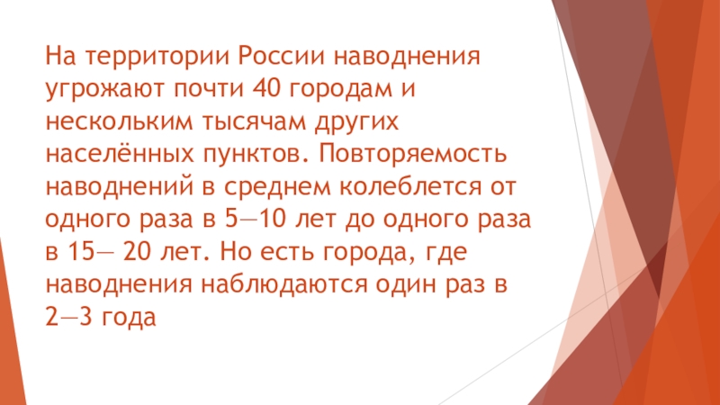 Слайд 3На территории России наводнения угрожают почти 40 городам и нескольким тысячам