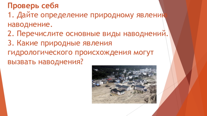 Проверь себя 1. Дайте определение природному явлению наводнение. 2. Перечислите основные виды наводнений. 3. Какие природные явления
