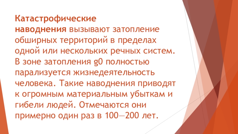 Катастрофические наводнения вызывают затопление обширных территорий в пределах одной или нескольких речных систем. В зоне затопления g0 полностью