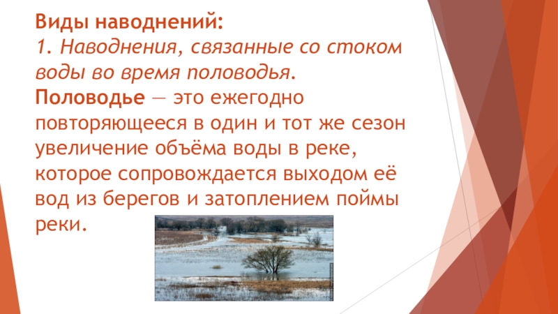 Виды наводнений: 1. Наводнения, связанные со стоком воды во время половодья. Половодье — это ежегодно повторяющееся в один