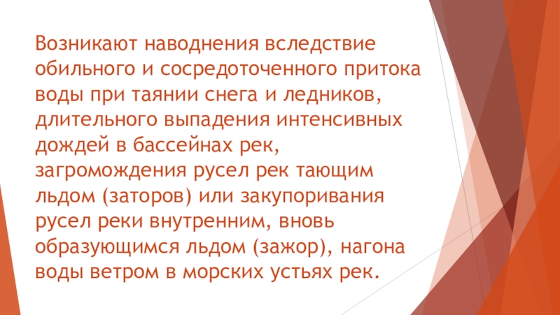 и ледников, длительного выпадения интенсивных дождей в бассейнах рек, загромождения русел рек тающим льдом (заторов) или закупоривания русел реки внутренним, вновь образующимся льдом (зажор), нагона воды ветром в морских устьях рек.