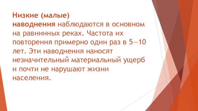 Слайд 11Низкие (малые) наводнения наблюдаются в основном на равнинных реках. Частота их повторения