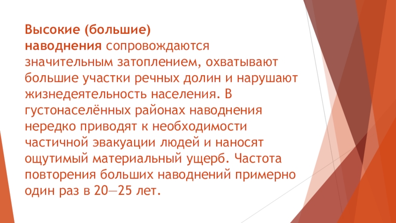 Слайд 12Высокие (большие) наводнения сопровождаются значительным затоплением, охватывают большие участки речных долин и