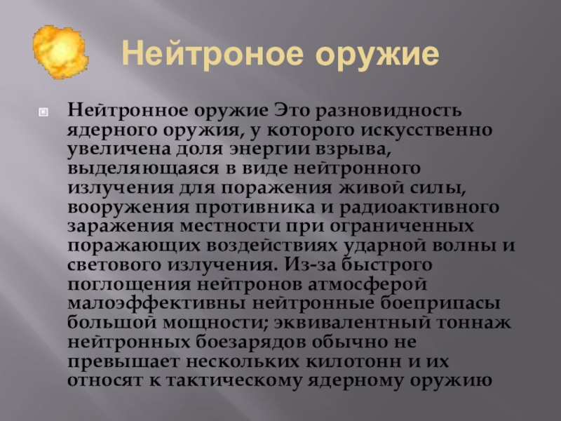 Нейтроное оружиеНейтронное оружие Это разновидность ядерного оружия, у которого искусственно увеличена доля энергии взрыва, выделяющаяся в виде