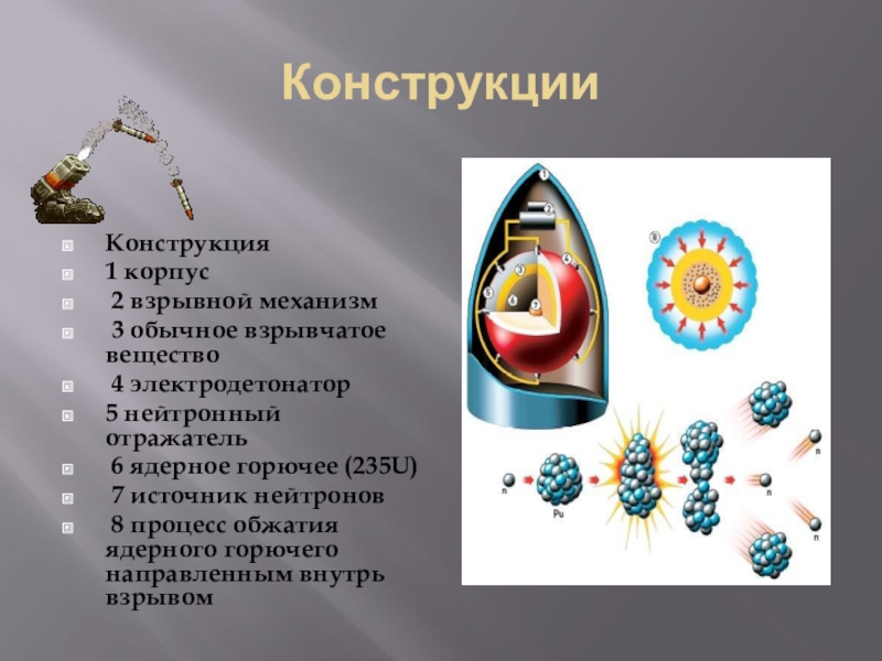 КонструкцииКонструкция 1 корпус 2 взрывной механизм 3 обычное взрывчатое вещество 4 электродетонатор 5 нейтронный отражатель 6 ядерное