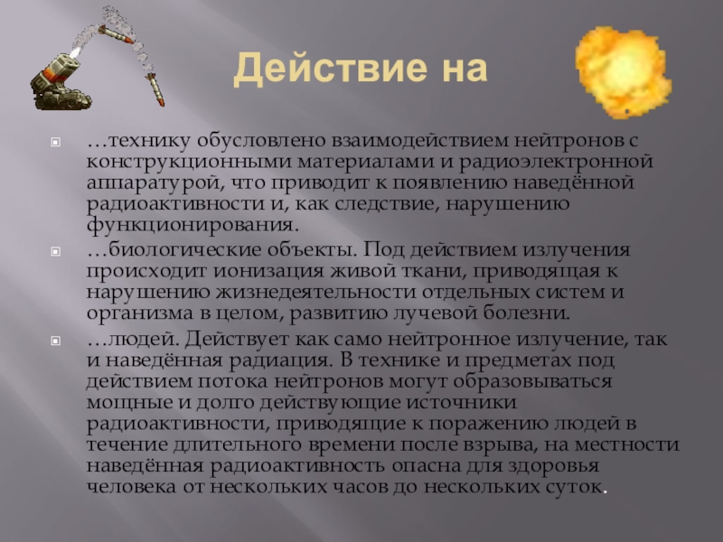 Действие на…технику обусловлено взаимодействием нейтронов с конструкционными материалами и радиоэлектронной аппаратурой, что приводит к появлению наведённой радиоактивности
