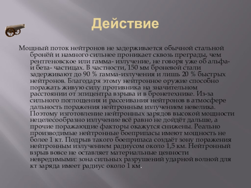 ДействиеМощный поток нейтронов не задерживается обычной стальной бронёй и намного сильнее проникает сквозь преграды, чем рентгеновское или