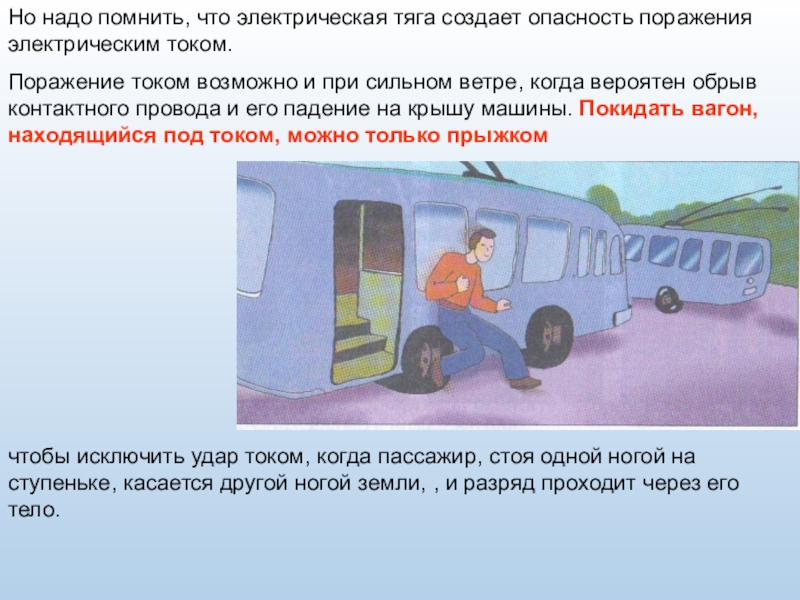 чтобы исключить удар током, когда пассажир, стоя одной ногой на ступеньке, касается другой ногой земли, , и разряд проходит через его тело.