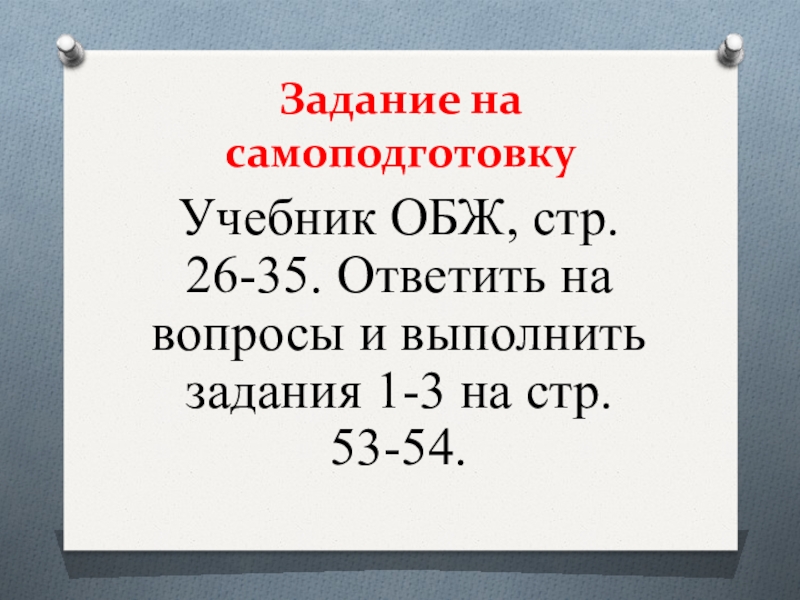 Задание на самоподготовкуУчебник ОБЖ, стр. 26-35. Ответить на вопросы и выполнить задания 1-3 на стр. 53-54.