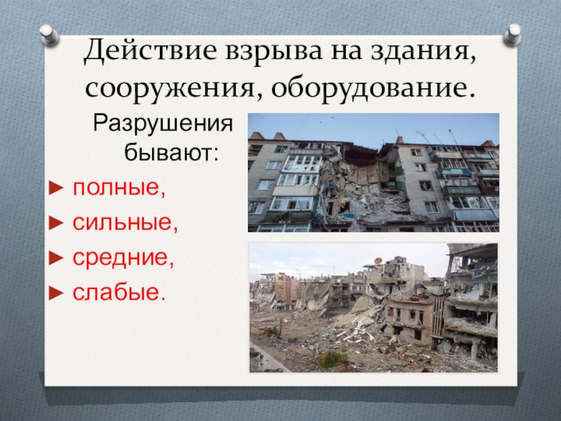 Действие взрыва на здания, сооружения, оборудование.Разрушения бывают: полные,сильные,средние,слабые.
