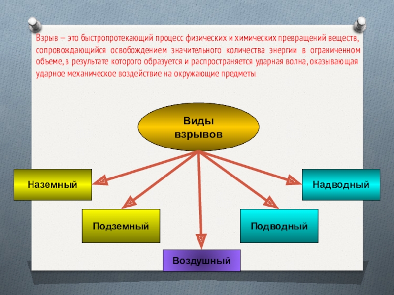 Виды взрывовНаземный Подземный Воздушный Подводный Надводный Взрыв — это быстропротекающий процесс физических и химических превращений веществ, сопровождающийся