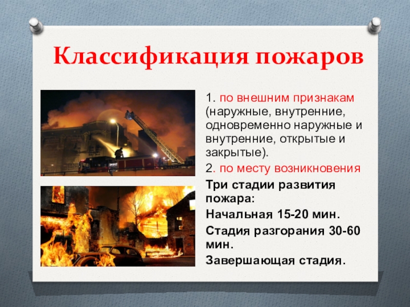 Классификация пожаров 1. по внешним признакам (наружные, внутренние, одновременно наружные и внутренние, открытые и закрытые).2. по месту