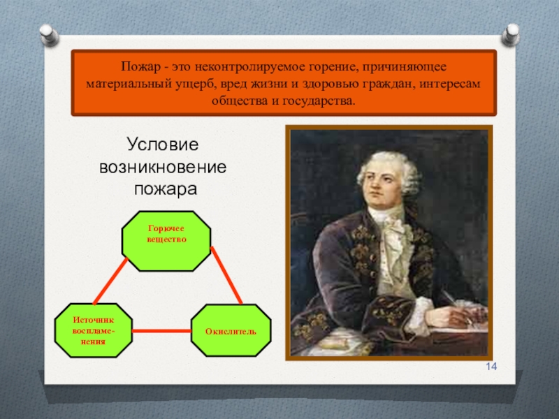 Условие возникновение пожараГорючеевеществоИсточник воспламе-ненияОкислительПожар - это неконтролируемое горение, причиняющее материальный ущерб, вред жизни и здоровью граждан, интересам