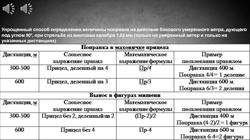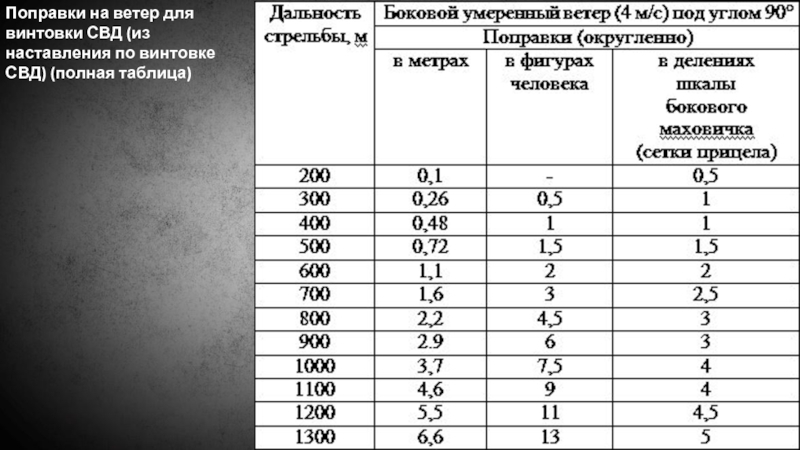 Слайд 4Поправки на ветер для винтовки СВД (из наставления по винтовке СВД)